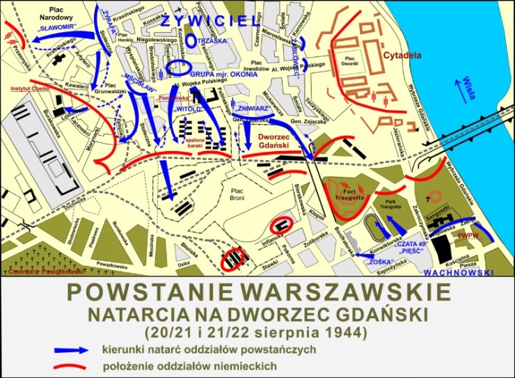 Był to rejon całkowicie opanowany przez wojska niemieckie. Dworzec wraz z zespołem sąsiednich obiektów tworzył jeden z najsilniejszych ośrodków niemieckiego oporu. W chwili rozpoczęcia Powstania Niemcy dysponowali tam oddziałami o sile 500 doskonale uzbrojonych żołnierzy, pociągiem pancernym nr 75 oraz artylerią rozmieszczoną w kilku punktach wokół dworca, m.in. na Cytadeli, w Forcie Legionów i Forcie Traugutta. Wzdłuż linii rozmieszczone były starannie zamaskowane betonowe bunkry i gniazda broni maszynowej. W wielu miejscach na przedpolu dworca Niemcy ustawili zasieki z drutu kolczastego. W dodatku przestrzeń pomiędzy tymi obiektami była zupełnie pusta, nie dającą możliwości jakiegokolwiek schronienia atakującym.