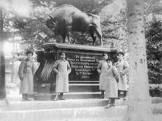 Historia rzeźby zaczyna się daleko stąd, kilkaset kilometrów na północny wschód od Spały i sięga czasów carskich, drugiej połowy wieku XIX. Wprawdzie rodzina carska bywała w Spale i nawet odbywały się tu polowania z udziałem cara, ale to nie ze spalskimi polowaniami wiążą się dzieje pomnika. Pierwotnym miejscem usytuowania posągu była osada Zwierzyniec na skraju Puszczy Białowieskiej, między Białowieżą a Hajnówką. Żeliwny pomnik został postawiony tam za czasów carskich, dla upamiętnienia wielkiego polowania w październiku roku 1860, które trwało dwa dni, a wśród zaproszonych gości byli przedstawiciele dworów panujących ówczesnej Europy. W trakcie owego polowania padło ok. 100 sztuk zwierza, a sam car Aleksander II ustrzelił 10 żubrów, w tym ponoć jednego wyjątkowo potężnego byka. Wówczas to zażyczył sobie, by na pamiątkę w miejscu polowania ustawiono statuę owego żubra naturalnej wielkości. Posąg, ważący 4 tony, wykonano w Petersburgu w zakładach Ogariewa, a zaprojektował go węgierski artysta Mihály Zichy, nadworny malarz cara Aleksandra II. Rzeźba w zamyśle miała być tyleż apoteozą króla Puszczy Białowieskiej, co też samego cara. W roku 1862 żeliwny żubr stanął w Zwierzyńcu, u wrót Puszczy Białowieskiej i stał tam 52 lata.