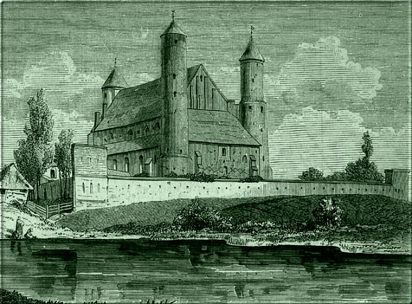 Kościół powstał w roku 1113, jako kościół drewniany. W roku 1331 drewnianą świątynię zastąpił kościół murowany wystawiony z fundacji książąt mazowieckich. Według legendy kościół zbudował rycerz Andrzej z Dinheim, który początkowo przebywał tutaj w charakterze jeńca po bitwie pod Płowcami, a później został gospodarzem tych ziem, pojąwszy za żonę córkę kasztelana.