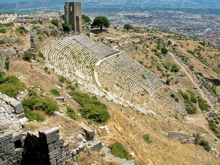 Nieco ponad dwieście kilometrów na północ, na wysoko wyniesionym przez naturę nadmorskim wzgórzu, rozlokował się Pergamon (dzisiejsza Bergama), rozsławiony swą biblioteką, w II i I w. p.n.e. konkurującą z księgozbiorem aleksandryjskim. Tu właśnie po raz pierwszy wyprodukowano prehistoryczny papier, nadając mu nazwę pergamin. Poza ruinami wspomnianej biblioteki zobaczyć można tu, jeden z wielu w Turcji, wspaniale zachowany teatr antyczny.