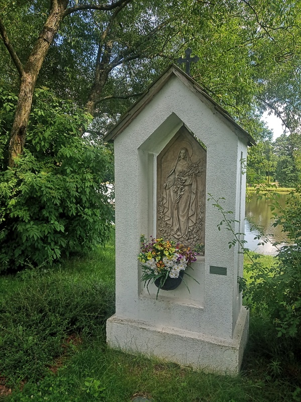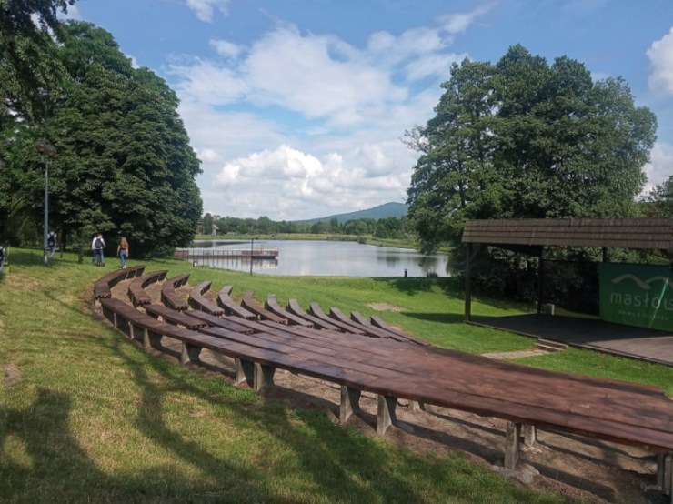 Nad stawem na wprost dworku umiejscowiono też zadaszoną scenę, a przed nią półkoliście ustawione ławki dla publiczności.
