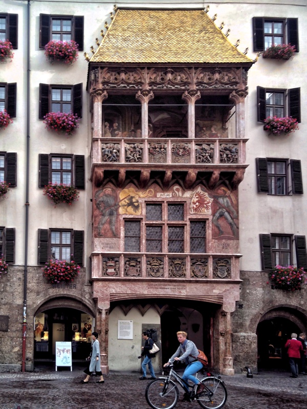 Jedna z nich nosi nazwę Goldenes Dachl. Jak łatwo się domyślić patrząc na obiekt lub zdjęcia, nie znając nawet niemieckiego, znaczy to: Złoty Dach. To zdecydowanie najbardziej znany budynek miasta. W zasadzie to być w Innsbrucku i nie zobaczyć Złotego Dachu, to trochę tak, jak być w Rzymie i nie widzieć papieża.😉 Bez wątpienia jest to najczęściej odwiedzane miejsce w Innsbrucku i z największym przepychem udekorowana budowla.