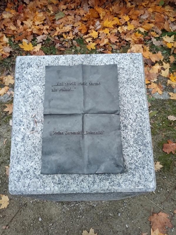 Pomnik Żeromskiego jest relatywnie nowy, bo ustawiono go w 2016 r., w 152 rocznicę urodzin pisarza. Dokładniej rzecz biorąc, to jest to kompozycja rzeźbiarska, pomnik oraz „kartki” z cytatami z utworów Żeromskiego. Rocznica trochę nierówna, ale każda rocznica byłaby dobra dla upamiętnienia tak znakomitego mieszkańca Konstancina.