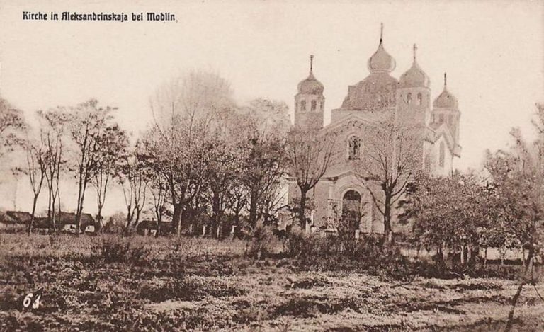 W okresie pierwszej wojny światowej cerkiew św. Aleksandry została zbombardowana przez niemieckie lotnictwo i doznała poważnych uszkodzeń, dlatego po wojnie cerkiew rozebrano. Nabożeństwa w tym czasie celebrowano w domu parafialnym. Później postawiono w tym miejscu nową cerkiew, znacznie mniejszą i o jednej kopule.