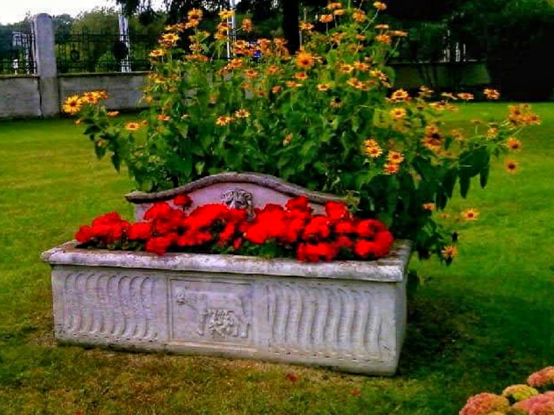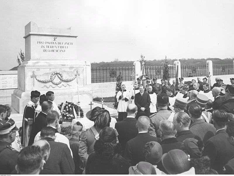 Jeszcze jeden element nie przetrwał do naszych czasów. Oś główną zamykał dawniej pomnik w kształcie sarkofagu, ustawiony przed ołtarzem, z wyrytym na nim napisem „Pro Patria defuncti in terra fideli requiescunt” (łac. „Polegli za Ojczyznę spoczywają wiernie w ziemi”). Podobnie jak brama triumfalna wykonany był z nietrwałego materiału i został rozebrany.