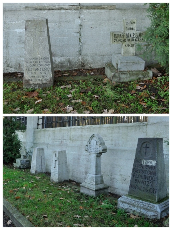 Warto zwrócić także uwagę na nagrobki przy murze. To autentyczne nagrobki wykonane przez jeńców włoskich dla swoich zmarłych kolegów. Zostały przeniesione z cmentarzy jenieckich.