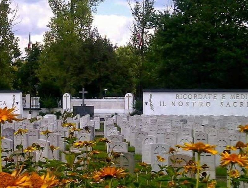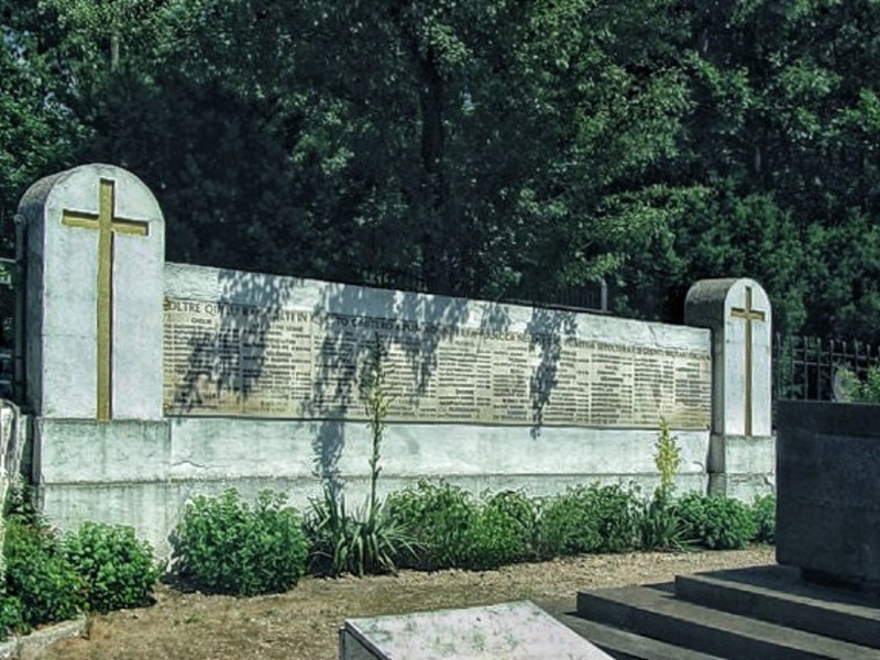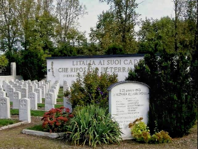 Szczątki ekshumowano z cmentarzy wojennych w różnych miejscach Polski i przeniesiono na warszawskie Bielany. Na murze za ołtarzem wśród zatartych już nieco napisów można odczytać nazwiska i nazwy miejscowości. To wspomnienie żołnierzy nigdy nie odnalezionych, a także tych którzy nie zostali ekshumowani, a ich szczątki pozostały w miejscu pierwotnego pochówku. Informuje o tym napis po włosku umieszczony ponad tablicą memoratywną: OLTRE QUELLI RACCOLTI IN QUESTO CIMITERO RIPOSANO IN TERRA POLACCA NELLA LORO PRIMITIVA SEPOLTURA I SEGUENTI MILITARI ITALIANI (Oprócz tych zebranych/zgromadzonych na tym cmentarzu, w ziemi polskiej spoczywają, w swoich pierwotnych grobach/pochówkach (lub miejscach pierwotnego pochowania) następujący włoscy wojskowi). Wśród miejscowości wymienione zostały m.in.: Kołomyja, Stanisławów, Kołesniki, Stryj, Kossów, Lwów, Jarosław, Sanok, Przemyśl, Zakopane, Trzebinia, Dębica, Wiśnicz Nowy… Jak widać – to tereny dawnej Galicji. Znaczy to, że żołnierze włoscy umierali w niewoli austriackiej. Są też nazwy miejscowości ze Śląska i z Wielkopolski, m.in.: Katowice, Rybnik, Staszów, Dąbrowa Górnicza, Kalisz, Inowrocław, Poznań. Tu były obozy niemieckie, gdzie zmarli Włosi wzięci do niewoli przez armię Cesarstwa Niemieckiego.