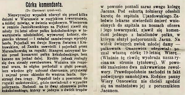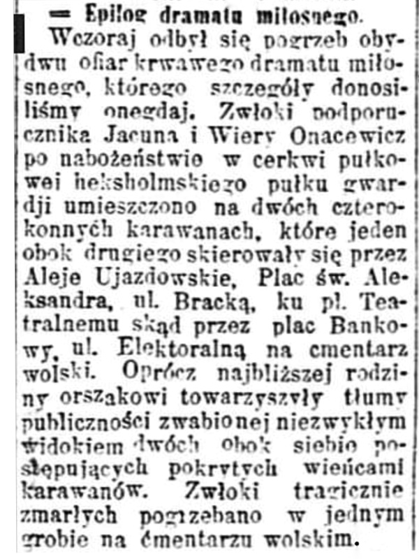 Oficer zmarły nazywa się Georgij Jacun, liczył lat 24, był podporucznikiem petersburskiego pułku gwardji. Młodzi ludzie podobno od dłuższego czasu znali się i poczuli do siebie sympatję, tak że mieli zamiar połączyć się węzłem małżeńskim. Tym planom lepszej przyszłości stanęła na drodze wola rodziców, którzy małżeństwa tego sobie nie życzyli. Młodzi jednak widocznie woleli śmierć niż rozłąkę. Sądząc ze znalezionych w karecie 2 rewolwerów przypuszczać należy, że młodzi postanowili oboje dokonać samobójstwa. Widocznie jednak w ostatniej chwili nastąpiła zmiana postanowienia, gdyż rewolwer należący do Wiery Onacewicz był nienaruszony. Natomiast z rewolweru podporucznika Jacuna wystrzelono dwakrotnie. Wynika z tego, że podporucznik Jacun zastrzelił najpierw Wierę, potem sobie życie odebrał.”