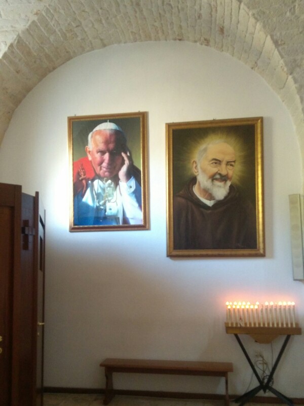 W środku, w skromnym wnętrzu, w niewielkiej bocznej kaplicy na lewo od wejścia, miło zaskoczy nas, Polaków, wizerunek Papieża – Polaka. I to w towarzystwie ogromnie we Włoszech poważanego Ojca Pio.