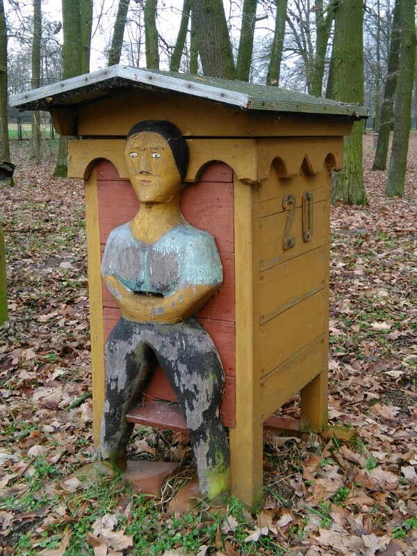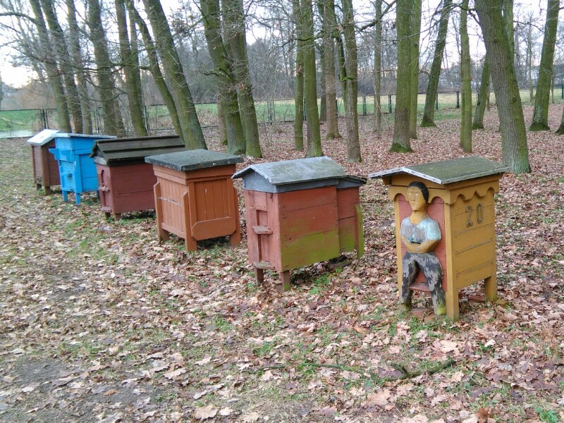 Całości wrażenia dopełniają stojące w pobliżu drewniane rzeźbione ule.