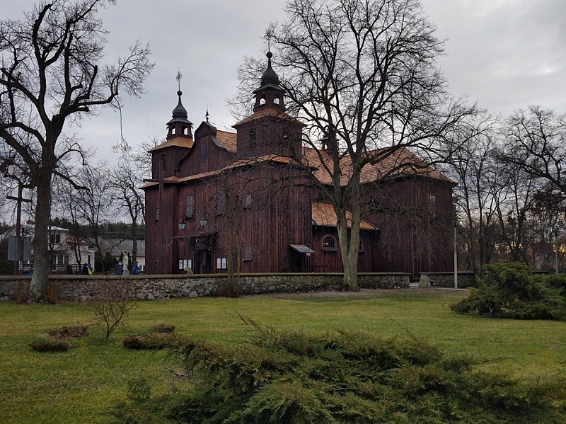 Drewniana świątynia już z zewnątrz przedstawia się okazale. Swym kształtem nie wyróżnia się szczególnie, przypomina inne drewniane Mazowsza. Jest za to od wielu z nich zdecydowanie większa.
