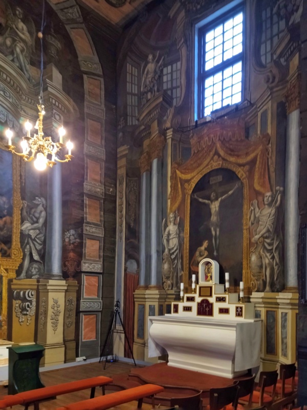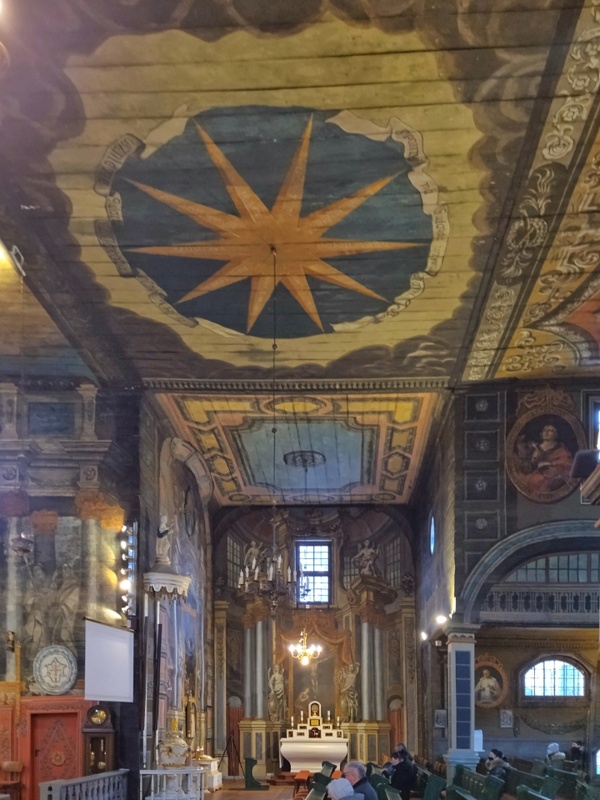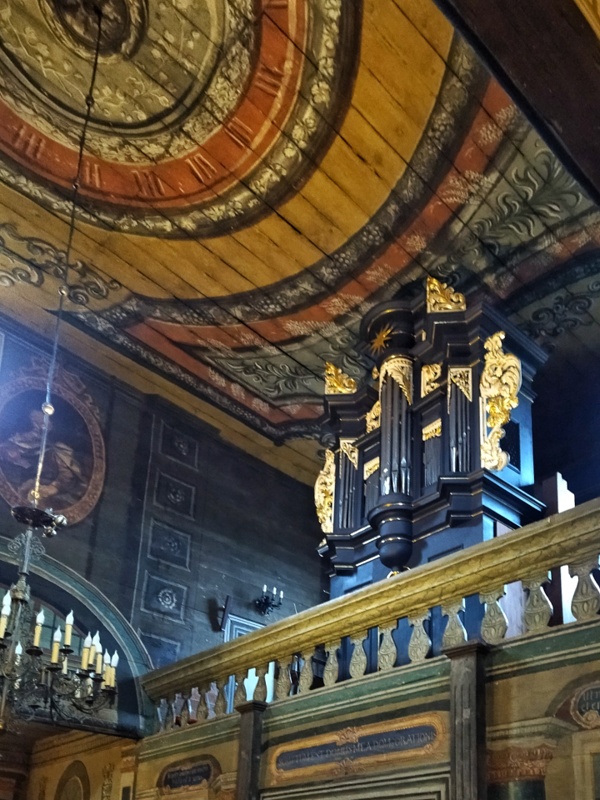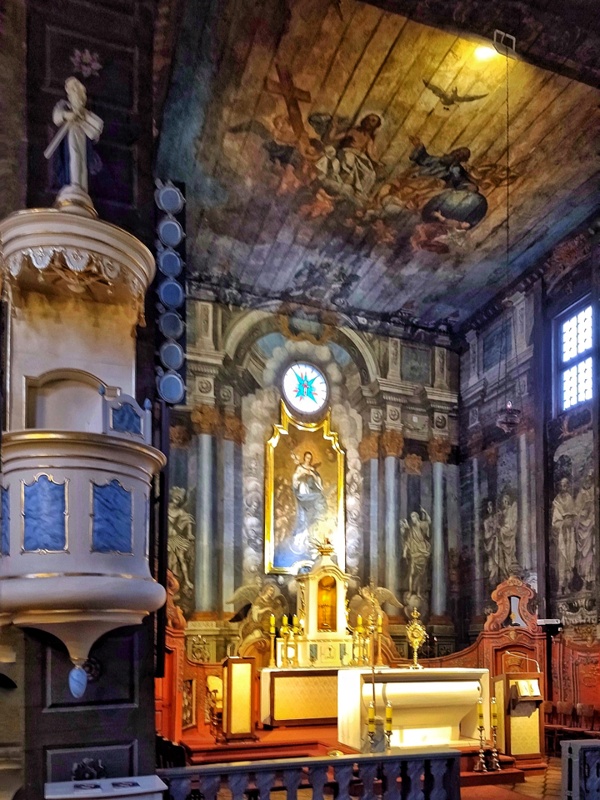 To, co robi jednak największe wrażenie znajduje się na ścianach i powale. Piękne, iluzjonistyczne polichromie z XVIII wieku to dzieło zakonnika, Jana Niezabitowskiego. Część malowana była bezpośrednio na deskach (zwłaszcza te na belkach sklepienia). Większość jednak powstała na płótnach. Nie dajcie się zwieść złudzeniu. Te wspaniałe ołtarze nie zostały wyrzeźbione w kamieniu i drewnie. To malowidła wykonane na tkaninach. Nie było to wcale wtedy jakimś szczególnym, wysublimowanym zabiegiem artystycznym. Po prostu ubogiego zakonu marianów nie stać było na marmurowe kolumny i drogie obrazy w złoconych ramach. Paradoksalnie, ta oszczędnościowa wersja dekoracji dzisiaj jest największym skarbem świątyni.