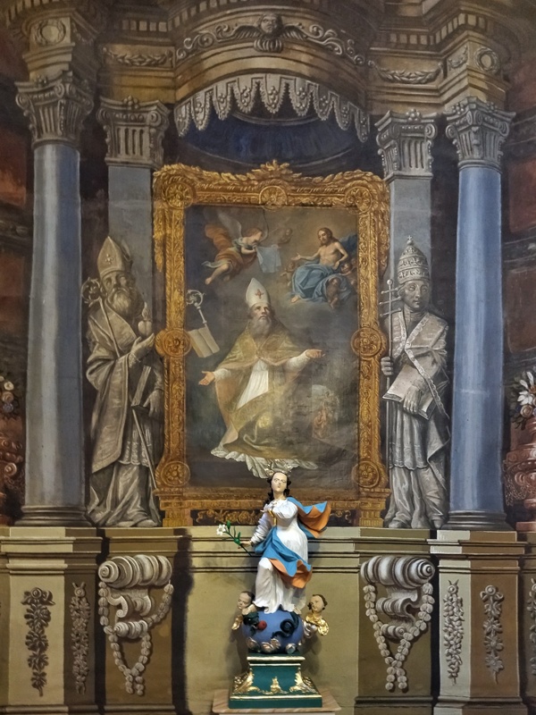 Między kolumnami ołtarza zobaczymy archaniołów: po lewej stronie Michała pokonującego szatana, po prawej Gabriela.