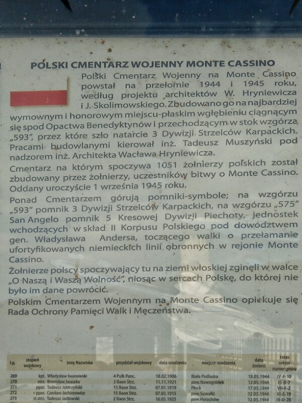 Przechodząc alejkami cmentarza warto wczytać się w napisy na nagrobkach. Widać z nich wymownie, jak rożnorodne było wojsko polskie, które walczyło na Monte Cassino. Natkniemy się tu na żołnierzy ze wszystkich ziem Rzeczypospolitej aż po Wołyń i Syberię, a także spoza jej granic – m.in. z Niemiec, Francji, Stanów Zjednoczonych, jak również wszystkich jej wyznań: katolików, grekokatolików, prawosławnych, protestantów, żydów, a nawet muzułmanów.