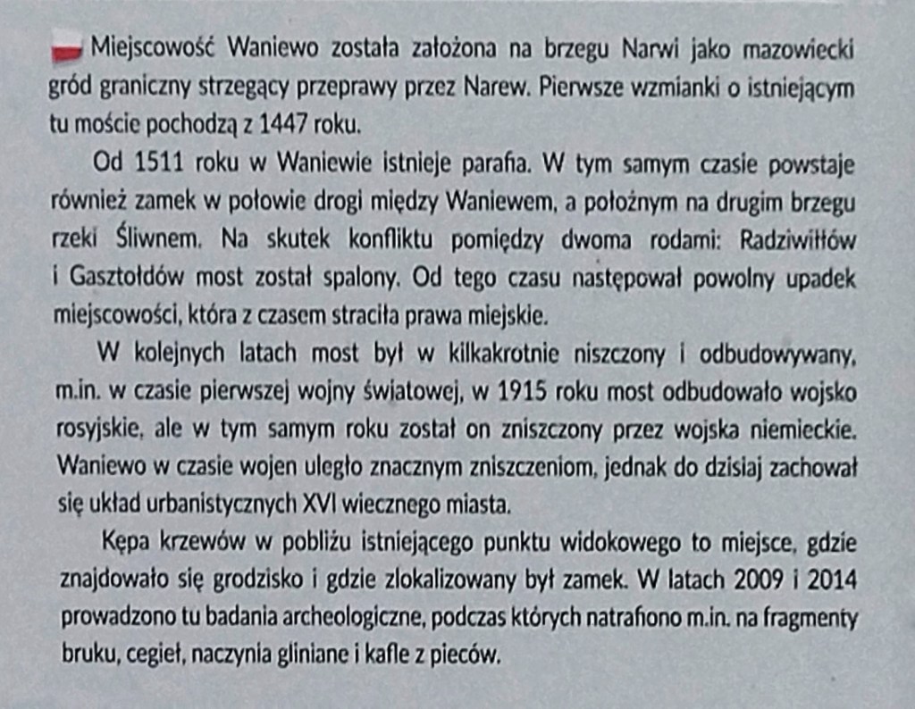 Z tablic opisujących dzieje okolicy dowiadujemy się, że Waniewo ma całkiem długą historię, sięgającą XV wieku. Niegdyś nawet stał tu zamek.