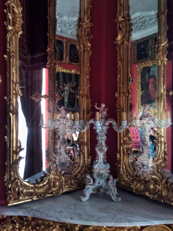 Ogólnego wrażenia dopełniają pozostałe meble, obrazy i lustra w kunsztownych, złoconych ramach oraz wspaniały żyrandol zwieńczony na suficie piękną sztukaterią. Żyrandole w pałacu to w ogóle oddzielny temat, wszystkie zachwycające, ogromne i oryginalne. Na każdy z tych żyrandoli gapiliśmy się po kilka minut, wpatrzeni niczym sroki w błyskotki.