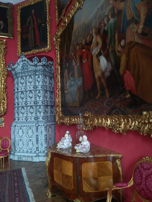W wyposażeniu wnętrza rzuca się w oczy olbrzymi piec z biało-niebieskich kafli, stojący w rogu. To jeden z trzech wykonanych na specjalne zamówienie. Obok na szafce porcelanowe figurki Chińczyków, bezwstydnie pokazujących języki i przy dotknięciu kiwających głowami.