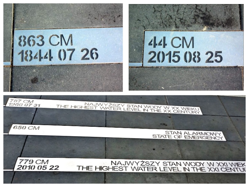 Wszystko to można sobie sprawdzić, jak również codzienny poziom naszej rzeki, na bulwarach nad Wisłą po stronie śródmiejskiej, tuż obok przejścia podziemnego na Mariensztat. Tam bowiem znajduje się elektroniczny wodowskaz i zamontowane w chodniku tablice z historycznymi ekstremalnymi stanami rzeki. Z nich dowiadujemy się też, iż stan alarmowy Wisły dla Warszawy to 650 cm. Wyższa fala zagraża już miastu i jego mieszkańcom. Jak widać że zdjęć nie raz w historii to się zdarzało. Wszystkie te tablice informacyjne umieszczono nieopodal miejsca, w którym w roku 1932 zamontowano pierwszy warszawski limnigraf, czyli urządzenie do mechanicznego pomiaru głębokości rzeki. O historii limnigrafu przeczytacie w odrębnym artykule: LIMNIGRAF WARSZAWSKI