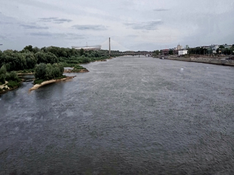 Skoro już wspominamy rok 2019. Zapisał się we współczesnej historii Wisły dwoma anomaliami. Nie tylko rekordowo niskim stanem wody latem. W czasie fali wezbraniowej w maju stan wody wynosił 579 cm. Latem zaś w ciągu kilku dni potrafił zmienić się o 100 cm, choć przez wiele tygodni wahał się na poziomie zaledwie ok. 45 – 55 cm. Nie znaczy to jednak wcale, że taką głębokość mamy na całej szerokości rzeki. Pomiarów dokonuje się bowiem przy brzegu ze względów praktycznych oraz dla żeglugi. Przystanie znajdują bowiem, co oczywiste, przy brzegach, a dla sternika informacja, czy ma tę przysłowiową stopę wody pod kilem jest podstawą do decyzji o wypłynięciu. W środku nurtu głębokość Wisły wynosi kilka metrów. Najgłębsze miejsce to rejon środkowych przęseł Mostu Poniatowskiego. Tam przy statystycznym stanie wody (czyli ok.150 -180 cm przy brzegu) głębokość rzeki sięga 9 metrów.