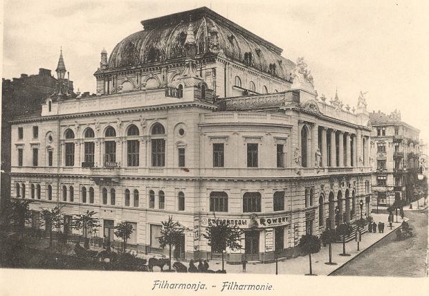 Wysoki gmach w centrum zdjęcia po lewej stronie to oczywiście Filharmonia, jeszcze w paradnym przedwojennym wystroju, który nie został przywrócony przy odbudowie z wojennych zniszczeń.