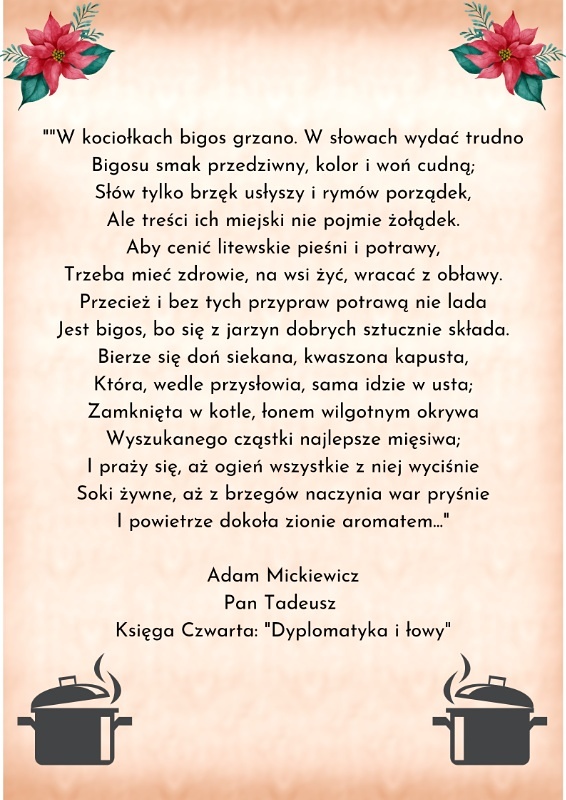 Zaopatrzeni w wiedzę teoretyczną możemy przystąpić do jej praktycznego wykorzystania.🙂Osoby z zacięciem kulinarnym być może wypróbują „literackie” propozycje, choć ogólnie wiadomo, że każdy specjalista od bigosu ma swój własny własny, tajemny przepis.