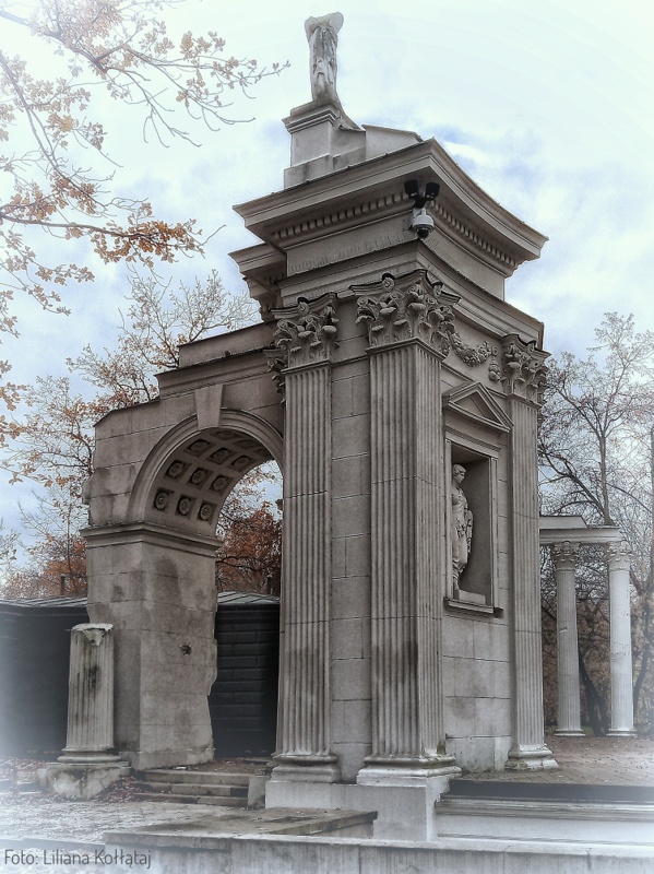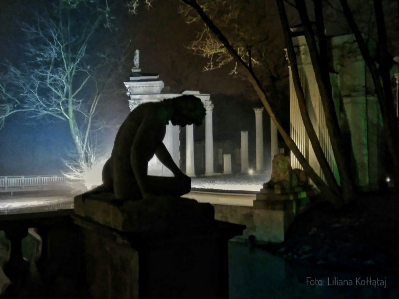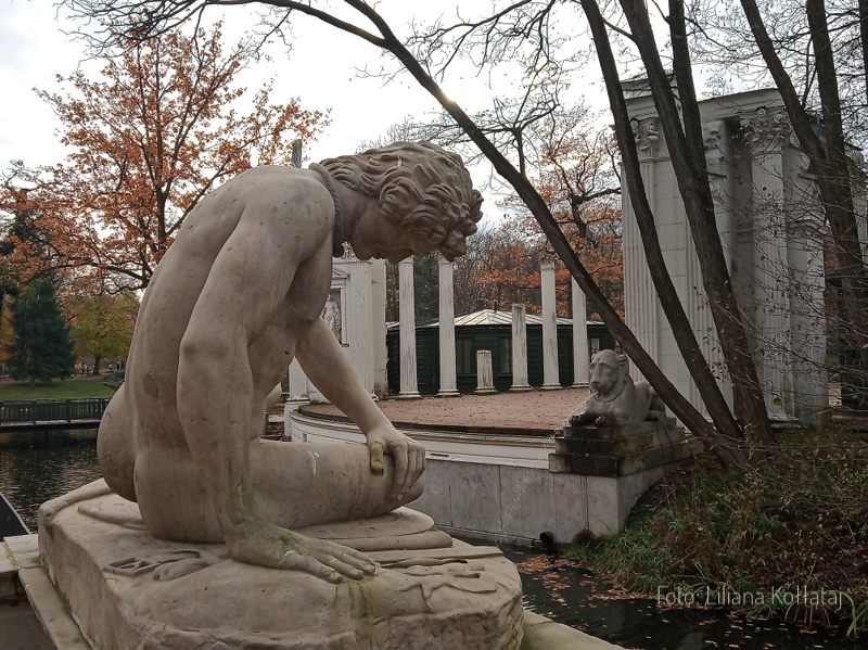 I jeszcze jedna postać z dekoracji Teatru, dla odmiany z dołu widowni. A nawet nie tyle z widowni, co u wejścia na teren teatru. Tej figury nie da się przeoczyć, bo jest to bez wątpienia jedna z najpiękniejszych i najbardziej ekspresyjnych rzeźb w Łazienkach. I moja ulubiona. Dlatego przedstawię ją Wam w kilku odsłonach.🙂