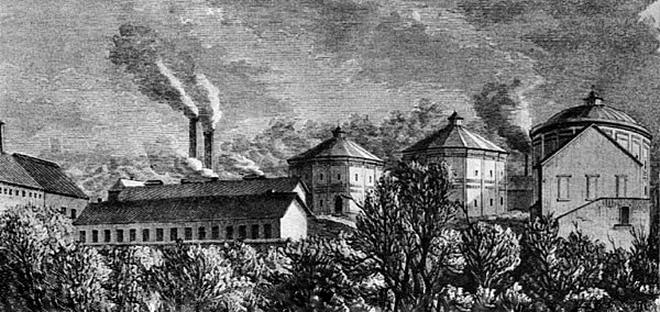 W 1856 Komitet Gazowy podpisał z Niemieckim Kontynentalnym Towarzystwem Gazowym w Dassau umowę koncesyjną na budowę gazowni. Wynikiem zawarcia umowy jako pierwsza była gazownia przy ul. Ludnej na Powiślu uruchomiona w 1856 roku. Działała praktycznie jeszcze w latach trzydziestych, ale w coraz mniejszym zakresie. Wzrastające zapotrzebowanie na gaz spowodowało, że wybudowano drugi obiekt, na Woli.