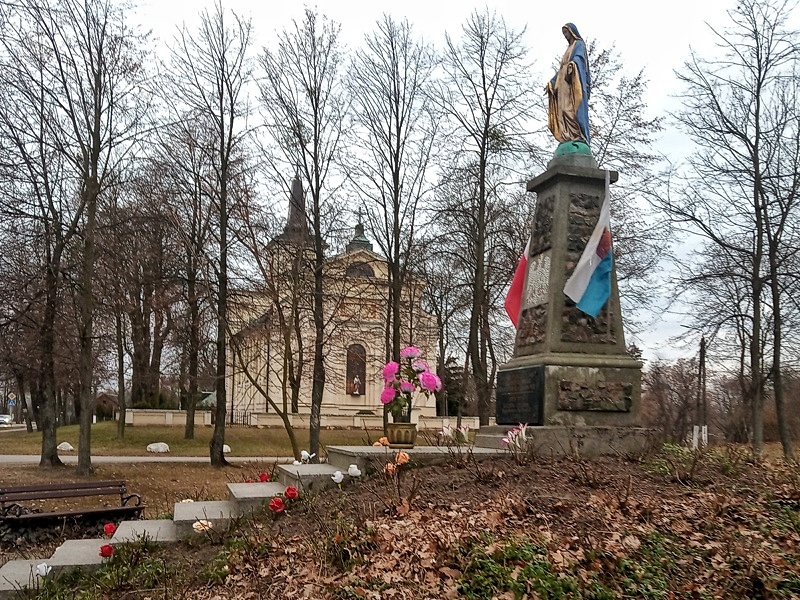 Zaborów, przy przystanku autobusowym Zaborów Szkoła, obok figury Madonny za kościołem.