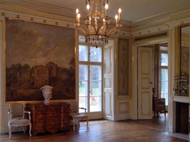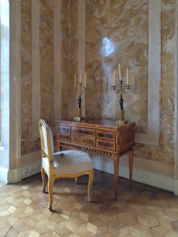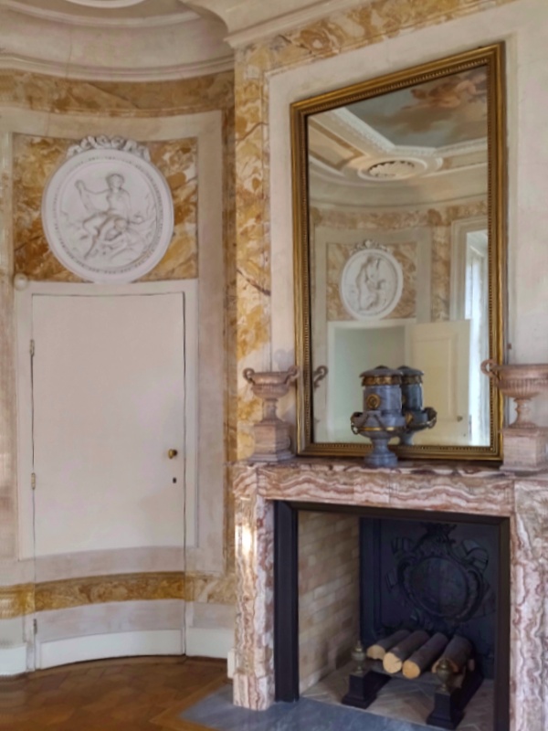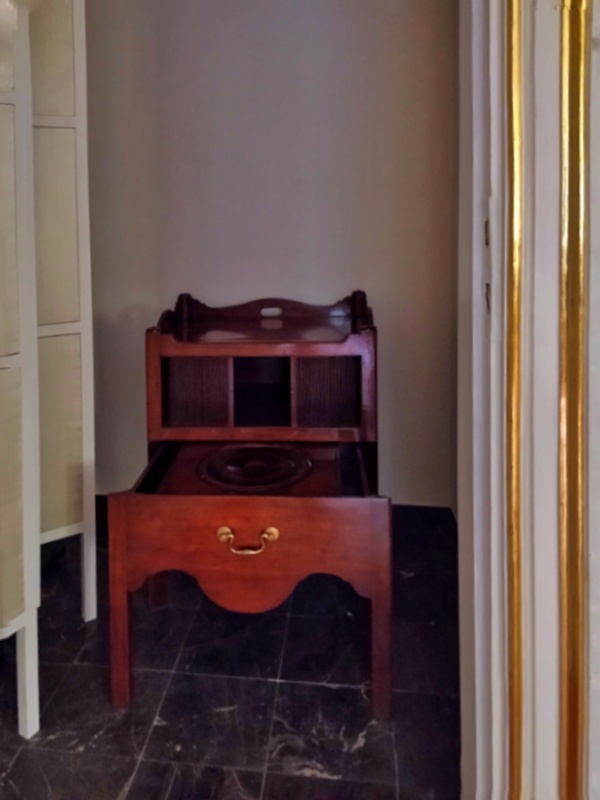 Tuż obok kominka zauważymy drzwi. Prowadziły one do tzw. miejsca sekretnego, czyli tego gdzie nawet królowie piechotą chadzali.🙂 W tym pałacu go nie obejrzymy, ale miejsce sekretne jest pięknie zaprezentowane w Białym Domku.