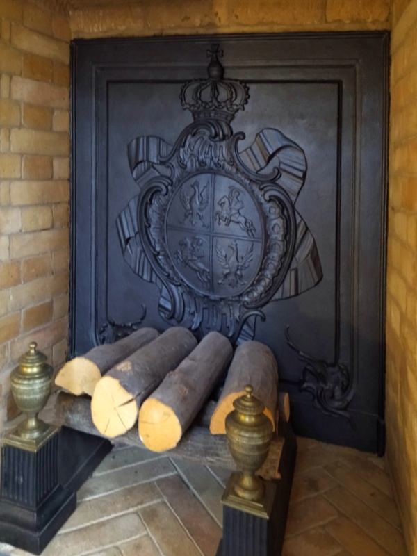 Podziwiając kominek warto schylić się i zajrzeć za palenisko. W okazałym kominku zwieńczonym lustrem zwraca uwagę płyta za paleniskiem ozdobiona herbem Rzeczypospolitej z czasów Stanisława Augusta, z naprzemiennie umieszczonymi polskim Orłem i litewską Pogonią, symbolizującymi unię dwóch państw i narodów.