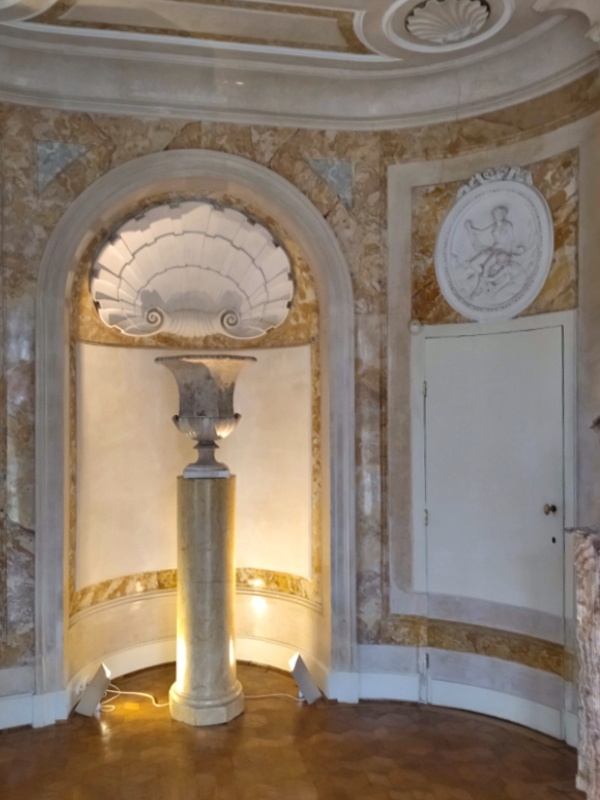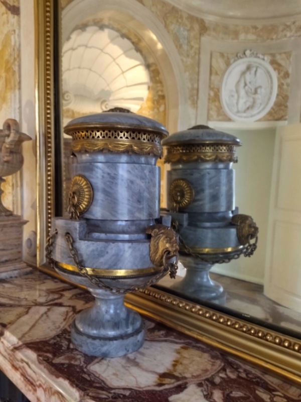 Zaskakuje urna ustawiona przed lustrem umieszczonym nad kominkiem. To nietypowa forma kadzielnicy, pojemnika na wonności, z którego roztaczały się aromaty podczas kąpieli.