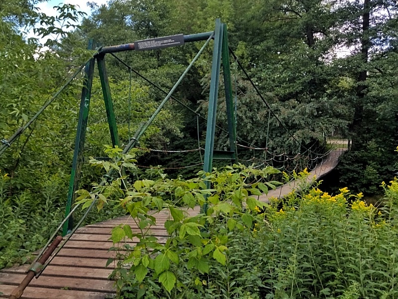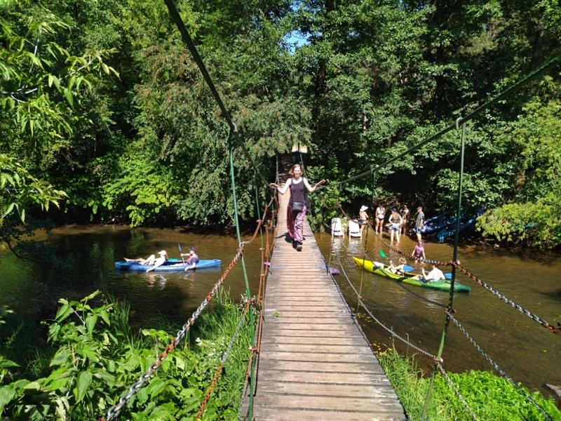 W trakcie wędrówki trafimy nawet na wiszącą kładkę. Nie jest to wprawdzie emocjonujący skywalk, ale też robi wrażenie, bo jednak wisi kilka metrów nad wodą.🙂