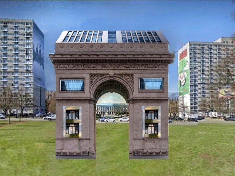 Łuk miał stanąć na pasie zieleni w ciągu ulicy Marszałkowskiej przy Ogrodzie Saskim (lokalizacja w tej okolicy przewijała się już wcześniej w wielu innych projektach) i mierzyć 52 m wysokości, czyli byłby wyższy od paryskiego l’ Arc de Triomphe na Placu Gwiazdy. Nie doszło jednak do ostatecznego porozumienia między londyńskim arystokratą a warszawskim ratuszem. Szczegóły pertraktacji nie zostały ujawnione opinii publicznej, ale ponoć główną przeszkodą było zbyt komercyjne podejście sponsorów do tematu. W pomysłach przewijał się bowiem wątek usytuowania w olbrzymiej budowli biur lub innych pomieszczeń do wynajęcia.