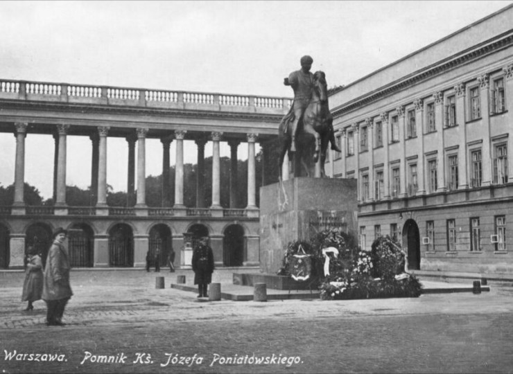 I wracamy do Warszawy na plac Saski. Kończy się I wojna światowa. Warszawę opuszczają zarówno Rosjanie jak Niemcy. Pałac-kamienica przy Placu Saskim po I wojnie przestaje być własnością Iwana Skwarcowa, a staje się siedzibą Sztabu Generalnego Wojska Polskiego. 3 maja 1923 na plac przed front gmachu wjeżdża na koniu jeden z najsłynniejszych dowódców armii polskiej – książę Józef Poniatowski, który właśnie dopiero co powrócił z trwającej kilkudziesiąt lat banicji w posiadłości Iwana Paskiewicza w Chomlu na Białorusi. Mowa oczywiście o pomniku.