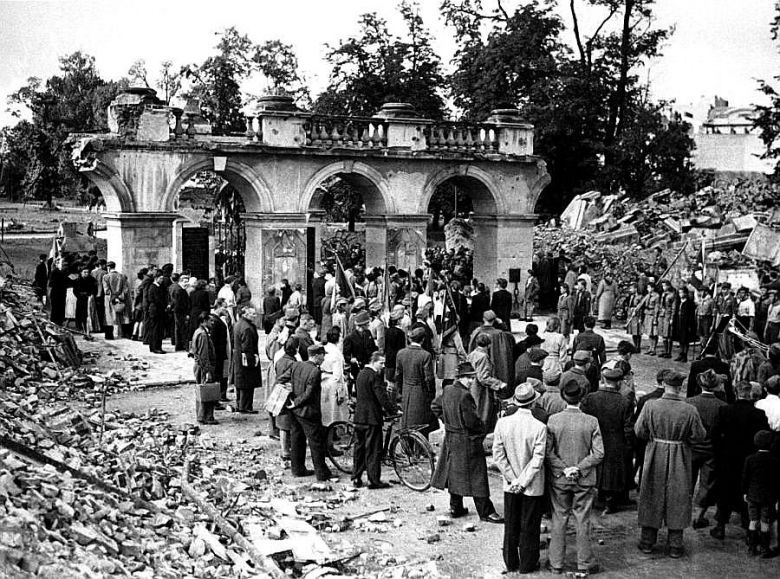 Odgruzowywanie Placu Saskiego trwa kilkanaście miesięcy. Wywieziono ponad 40 tys. m³ gruzu. W tym czasie powstaje projekt odbudowy Grobu Nieznanego Żołnierza. Tworzy go Zygmunt Stępiński, decydując się na formę ruiny – symbolu, zrekonstruowanego tylko tego fragmentu kolumnady zniszczonego Pałacu Saskiego, pod którym Grób znajdował się przed wojną. Odsłonięcie pomnika następuje 8 maja 1946 r.