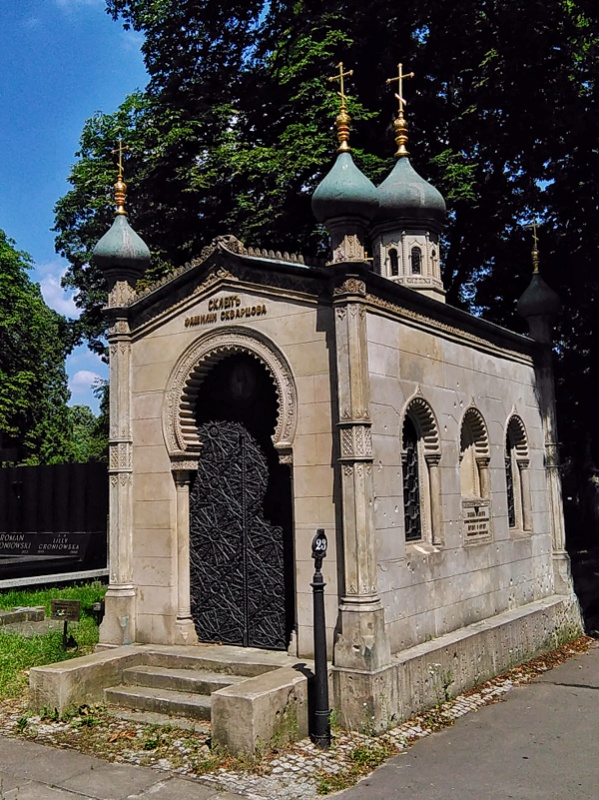 Dla mniej obytych z cyrylicą podrzucam tłumaczenie napisu na frontonie budowli: Grobowiec Rodziny Skwarcowa.