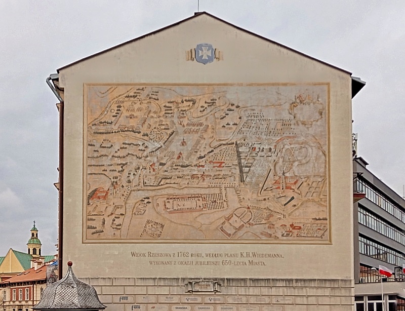 Natomiast spojrzeć z lotu ptaka na osiemnastowieczny Rzeszów można w centrum miasta, nieopodal kościoła św. Wojciecha i wylotu ulicy 3 Maja. Usytuowaną tam kamienicę zdobi ogromny mural z reprodukcją planu autorstwa kapitana Wiedemanna. A na tym muralu – mapie: po prawej stronie widać zamek Lubomirskich, a nieco wyżej w lewo od niego letni pałacyk z rozległymi jeszcze wówczas ogrodami.
