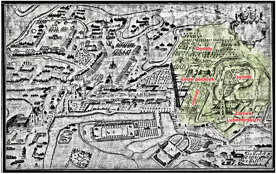 Dla większej czytelności dorzucam jeszcze nieco wyraźniejszą wersję z podpisami w opracowaniu czarno-białym. Tereny należące do Lubomirskich zaznaczyłam jasno zielonkawym kolorem. Jak widać, zajmowały one całkiem spory obszar.