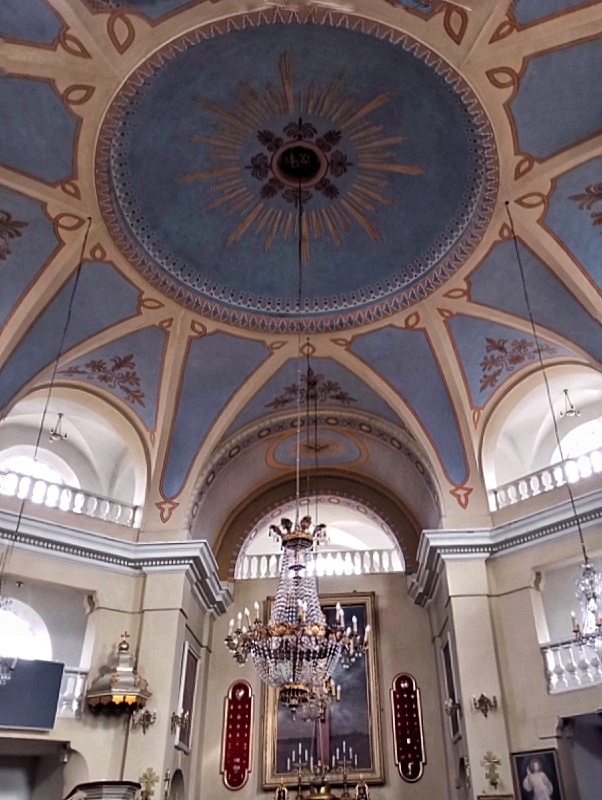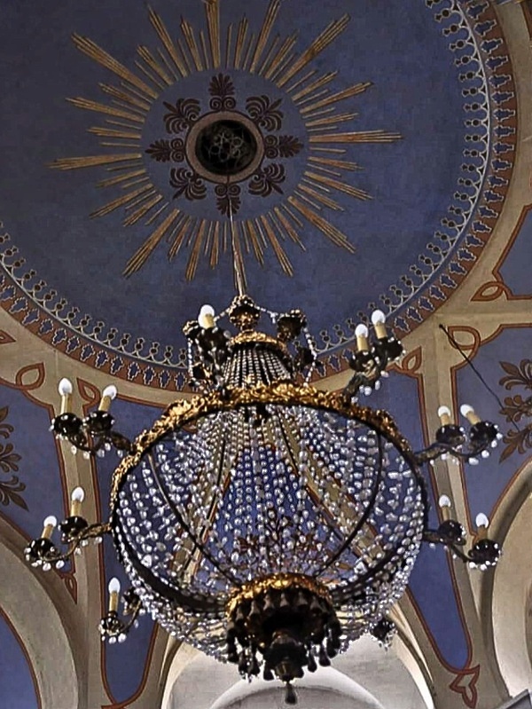 Zwraca też uwagę ogromny, przepiękny żyradol zawieszony pod kopułą. O nim niestety na razie nie mam bardziej szczegółowych informacji. Niewykluczone, że powstał w czasach budowy kościoła, z późniejszą wymianą opraw na świece na oświetlenie elektryczne.