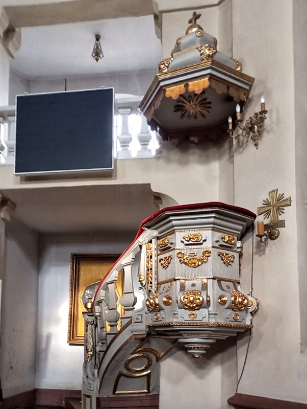 Całości wyposażenia wnętrza dopełniają bogate ołtarze boczne oraz delikatnie zdobiona klasycystyczna ambona.