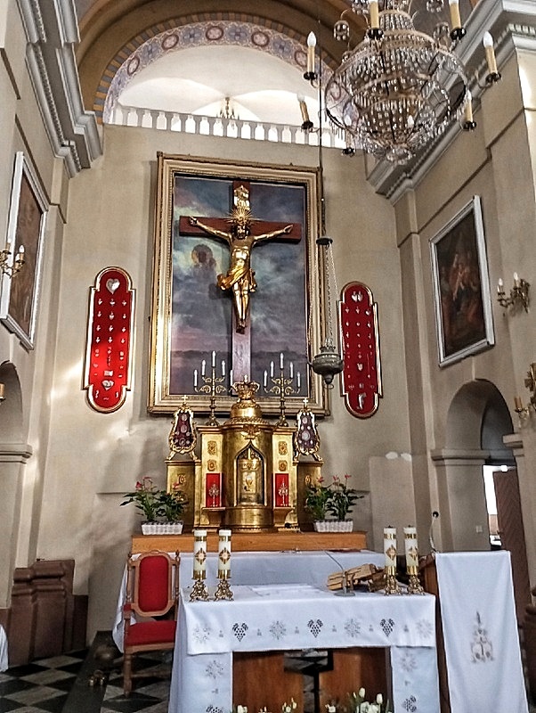 Centralne miejsce ściany ołtarzowej zajmuje potężny krzyż z figurą ukrzyżowanego Chrystusa, za którym umieszczono obraz będący współczesną repliką „Pod Twoją obronę” Józefa Chełmońskiego. Z okazji setnej rocznicy śmierci Chełmońskiego kopię tego obrazu wykonał konserwator zabytków Andrzej Lasek.