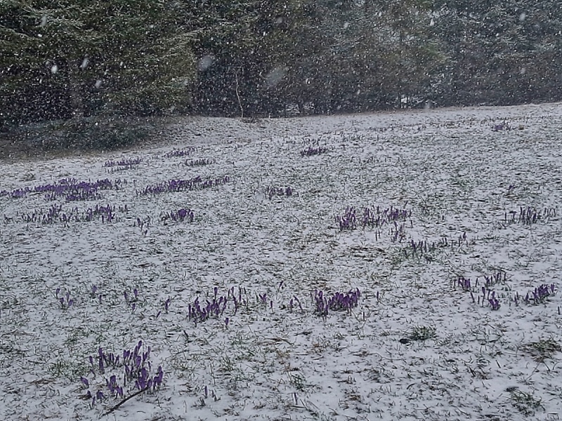 Pogoda w górach wczesną wiosną jest kapryśna i często zdarza się, że fioletowe łany zasypuje śnieg, nawet w sławnej z nich Dolinie Chochołowskiej. Nawet jeśli ich całkiem nie zasypie, to kwiatki w ochronie przed zimnem zwijają się w ciasne ruloniki, co widać na zdjęciach powyżej.