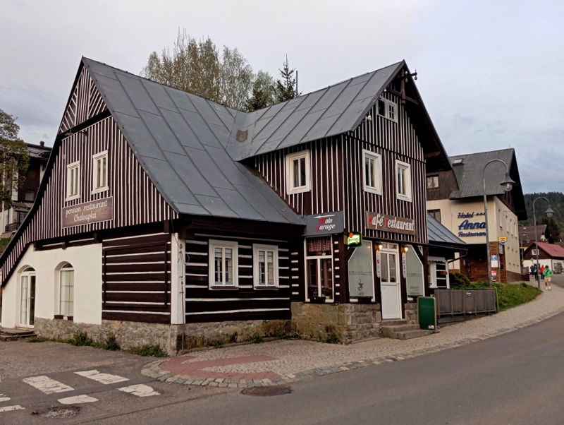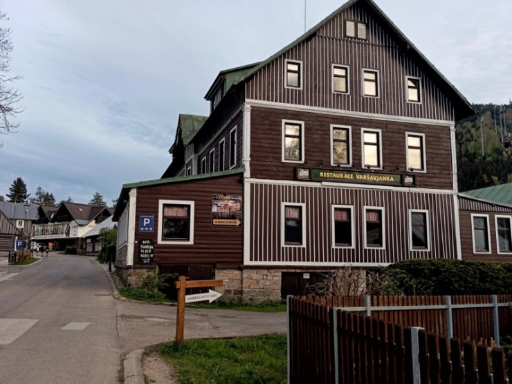 To pensjonat i restauracja „Varšavjanka”. To jeden z najstarszych w Harrachovie, powstał na przełomie XIX i XX wieku jako Hotel Erlebach. Nie udało mi się jeszcze ustalić, kto, kiedy i dlaczego dokonał zmiany nazwy.