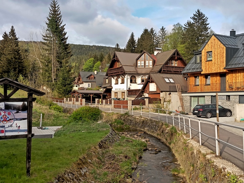 Na zakończenie spaceru warto pokręcić się jeszcze trochę po Harrachovie, bo to całkiem ładne miasteczko. W samym centrum zaskoczy nas nawet element warszawski. 🙂 To pensjonat i restauracja „Varšavjanka”. Co ciekawe – to jeden z najstarszych w Harrachovie, powstał na przełomie XIX i XX wieku jako hotel Erlebach. 🙂 Nie korzystaliśmy, więc nie możemy się wypowiedzieć na temat jakości, ale ponoć sympatyczna obsługa, fajny właściciel i smaczne jedzenie (jest mały mankament, pokoje są bez łazienek).