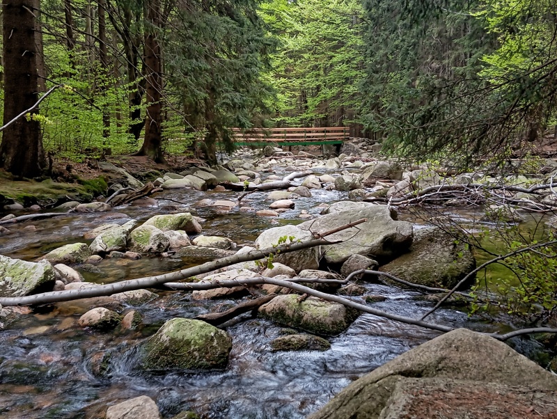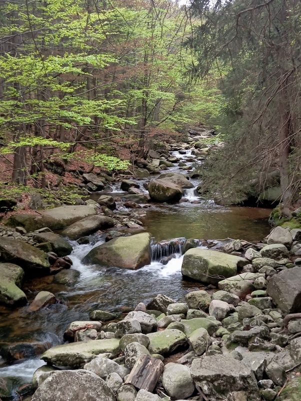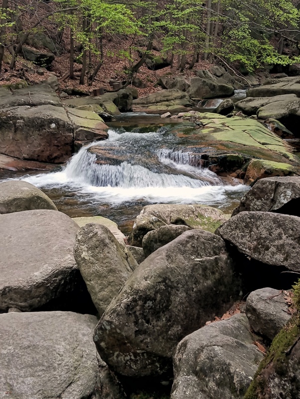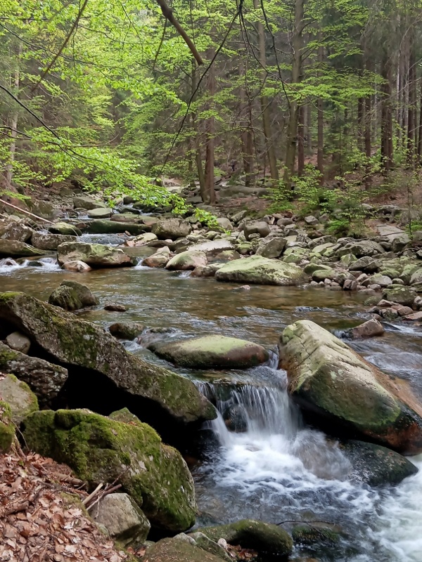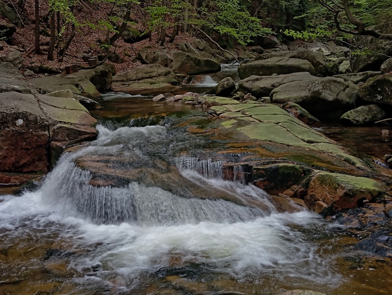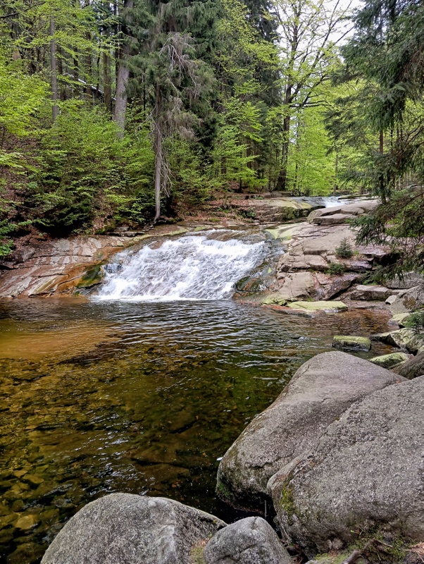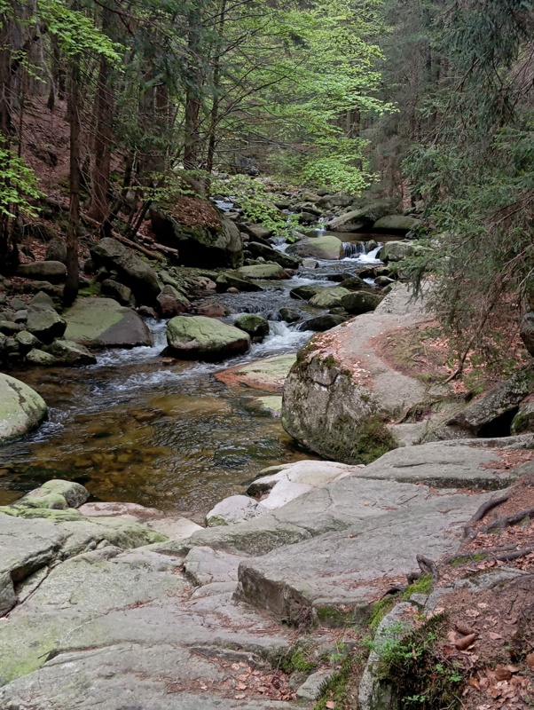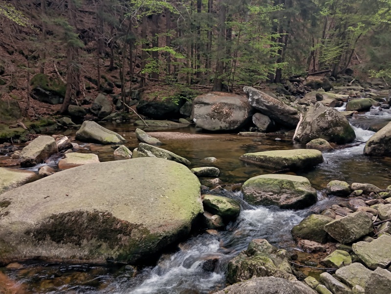 Gdy już nasycimy się pierwszym kontaktem z Mumlawą, wracamy do rozwidlenia szlaków , mijamy je i wędrujemy wzdłuż potoku w kierunku głównego wodospadu. Po drodze zapewne nie raz zdarzy się Wam skok w bok nad potok, bo trudno nie popatrzeć z bliska na takie widoczki. Mnie ściągało tam nad wodę co kilkaset metrów.😉🙂