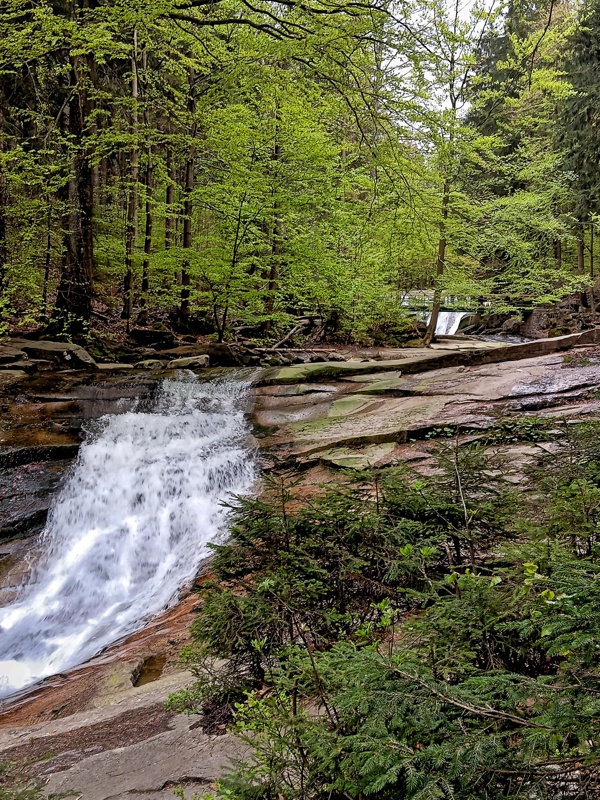 Wkrótce jednak, za zakrętem szlaku, dochodzimy do mostku i nagrodą za niewielki wysiłek jest widok głównego wodospadu w pełnej okazałości. Wspomniany wyżej mostek znajduje się dokładnie na wprost kaskady, co zapewnia widok panoramiczny na całe otoczenie we wszystkich kierunkach.