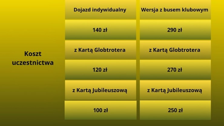 Tradycyjnie przewidujemy dwie opcje dojazdu – indywidualny własnym samochodem lub wspólny busem klubowym.