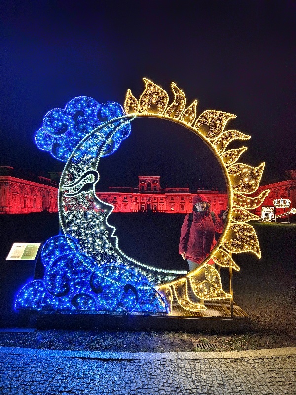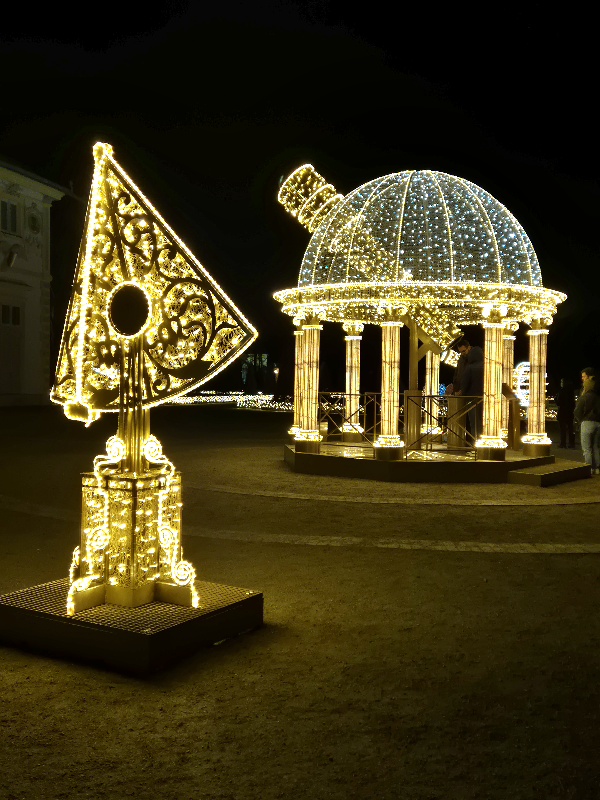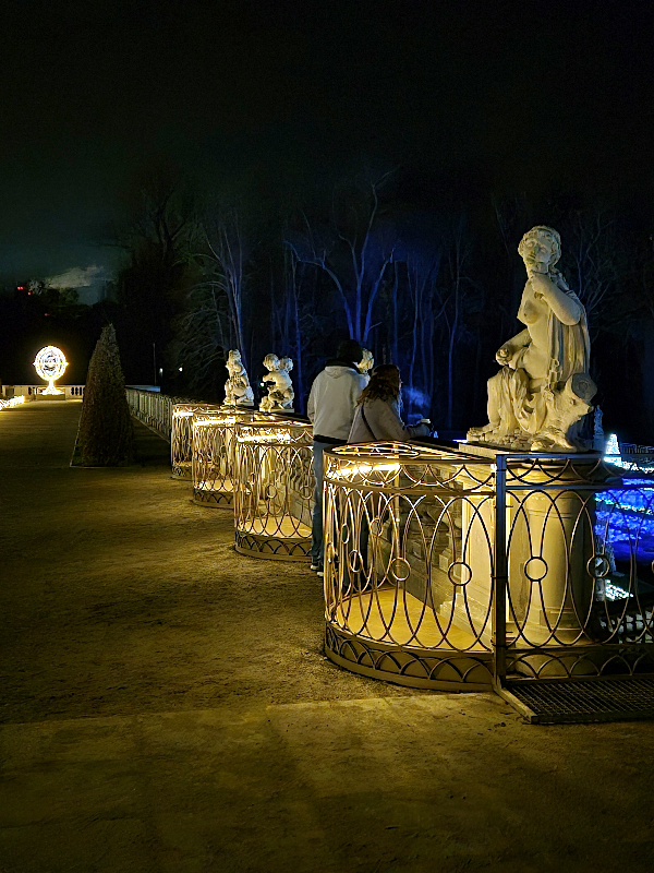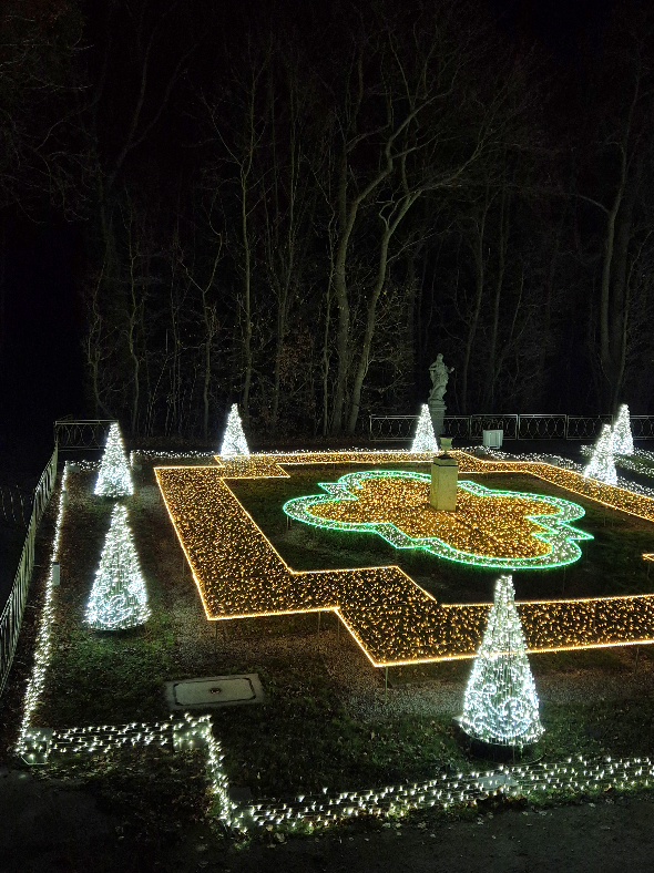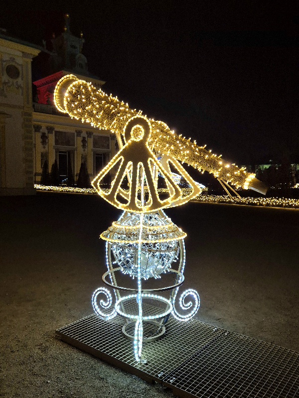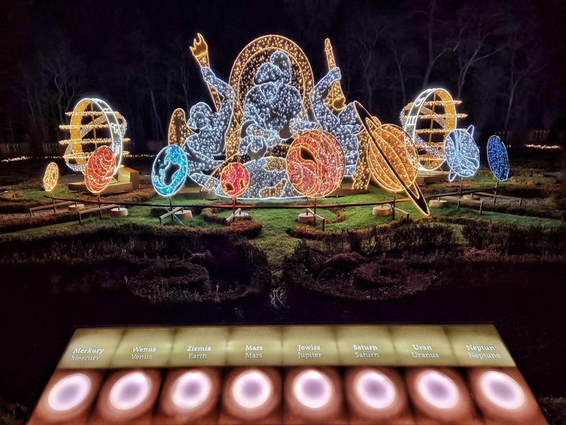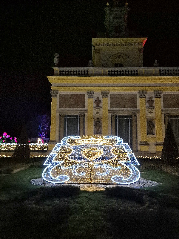 We wschodniej części, z tyłu za pałacem mamy kolejne części iluminacji, rozstawione na dwóch piętrach tarasów ogrodowych. Na górnym tarasie iluminacje z globusami, lunetami, planetami i gwiazdami odnoszą się do zainteresowań króla astronomią i geografią. Ten fragment ozdobiony jest także insygniami królewskimi, abyśmy przypadkiem nie zapomnieli u kogo jesteśmy w gościnie. 👑🙂