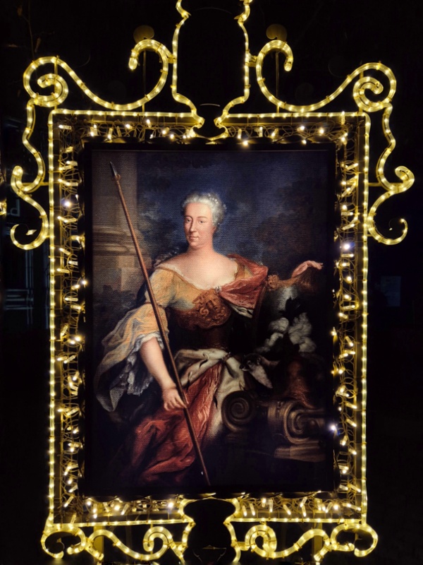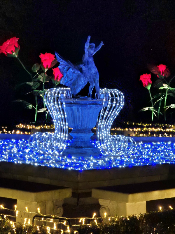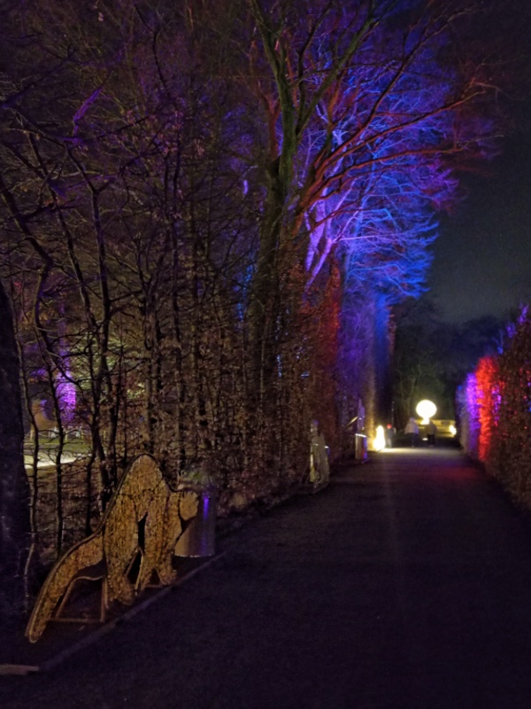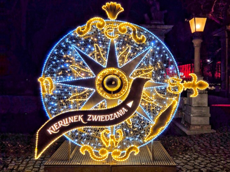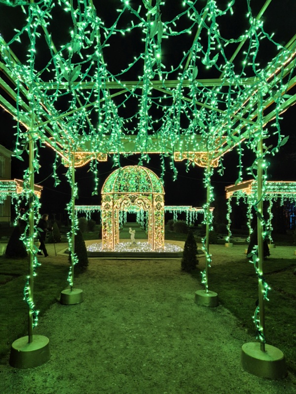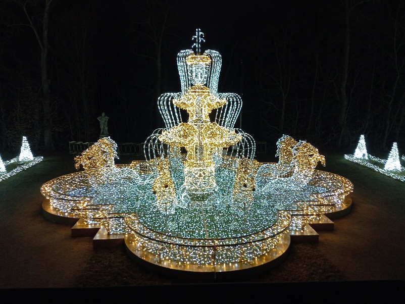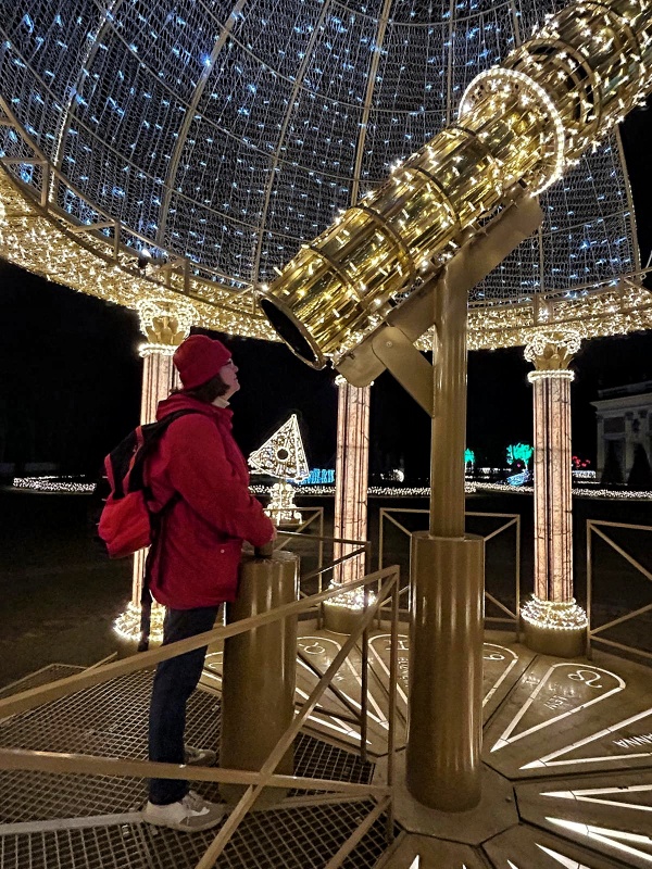 We wschodniej części, z tyłu za pałacem mamy kolejne części iluminacji, rozstawione na dwóch piętrach tarasów ogrodowych. Na górnym tarasie iluminacje z globusami, lunetami, planetami i gwiazdami odnoszą się do zainteresowań króla astronomią i geografią. Ten fragment ozdobiony jest także insygniami królewskimi, abyśmy przypadkiem nie zapomnieli u kogo jesteśmy w gościnie. 👑🙂
