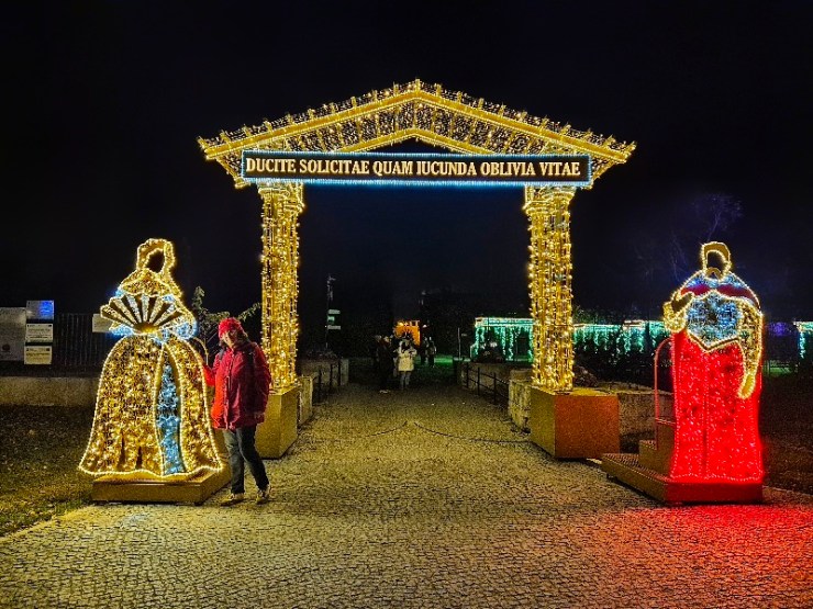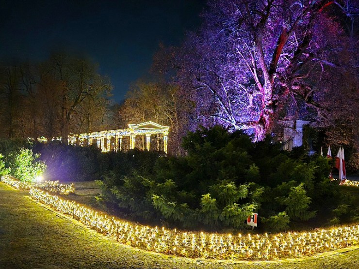 Ostatnia część płatnego obszaru to Ogród Różany, wydzielony i obstawiony płotkami. Tu jednak alejki pozwalają zbliżyć się do ogromnych, czterometrowych róż. Zimą świetlna kompozycja zastępuje rosnącą w tym miejscu latem piękną i pachnącą rabatę różaną, której tradycja sięga czasów pary królewskiej. Obydwoje uwielbiali kwiaty i wszelkie rośliny, a król niejednokrotnie osobiście sadził krzewy i drzewa wybrane i sprowadzone przez jego ukochaną Marysieńkę, nierzadko aż z jej rodzinnej Francji. Teraz wprawdzie róże nie pachnią, ale za to… ćwierkają.😃
